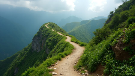Footpath winding on mountain ridge with landscape covered in clouds on Wugong Mountain in Jiangxi, China