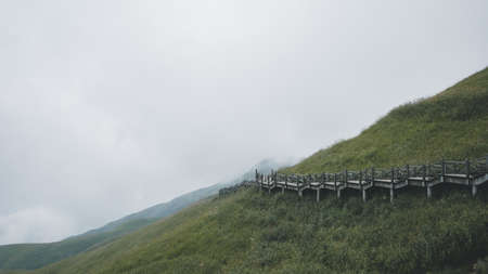 Wooden walking path across meadow on Wugong Mountain in Jiangxi, China