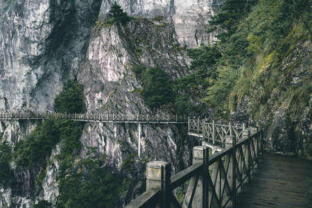 Wooden gallery road by cliff on top of Wugong Mountain (Wugongshan) in Jiangxi, China