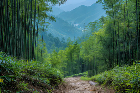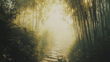 A serene mountain path bordered by tall bamboo, with mist rolling over the surrounding hills.