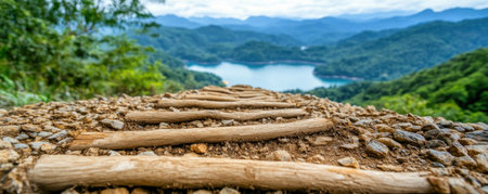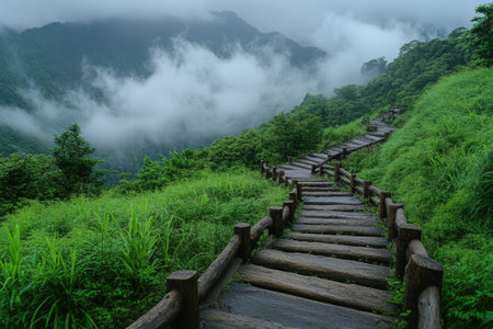 A wooden pathway winds its way through a lush mountain landscape, leading the viewer towards a distant horizon. The path is surrounded by green grass and trees, creating a sense of peace and tranquility. The sky above is bright and clear, illuminating the scene with natural light.