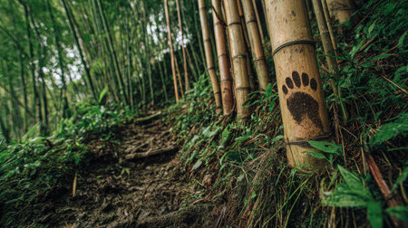 Chewed bamboo sticks beside a muddy footprint trail in a bamboo grove