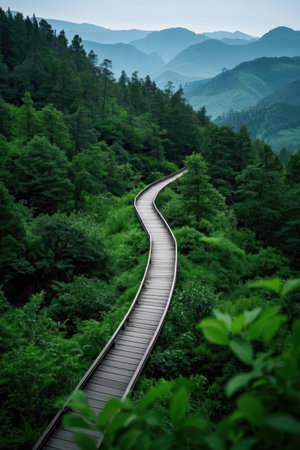 Wooden walkway in the middle of the forest razed to the mountains Picture