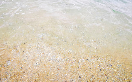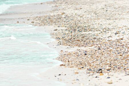 Beach sand with pebbles stones rocks colorful shells mussels and turquoise blue clear water texture pattern in Patong Kalim Beach Kathu District Phuket Island Province Southern Thailand in Southeast Asia.