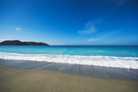 Tropical beautiful beach sand and sea with wave reaching shore with blue sky and white clouds, summer travel or vacation concept