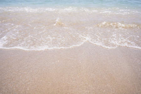 White foamy waves on sandy beach closeup. Seaside on sunny summer day. Summer vacation time concept.