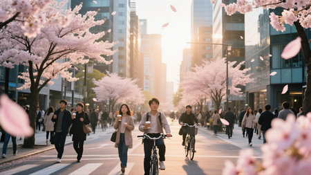 Unidentified people walking on the street with cherry blossoms in Tokyo, Japan