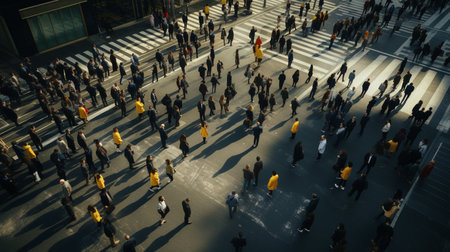 Candid street scene of a bustling city intersection with diverse crowd