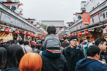 Tokyo, Japan-Apri 17, 2018: A boy on his father shoulder and tourist on Nakamise shopping street leading to Sensoji temple
