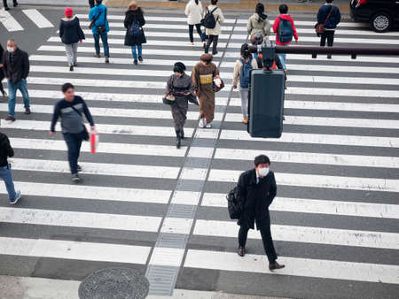 TOKYO, JAPAN - APR 11, 2019 : Japanese People walk on Crossing street. Crosswalk in City Businessman wearing Mask