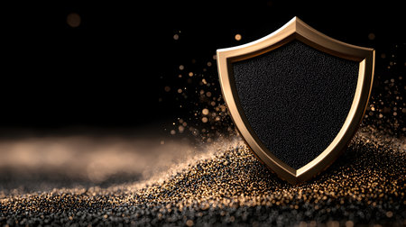 The image features a golden shield in the foreground on a textured dark background. Sparkling particles are scattered, enhancing the sense of security. The background is dark.