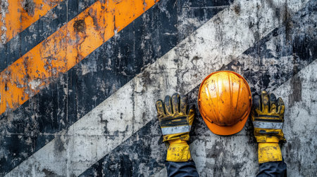 This image captures a close-up view of an orange hard hat and work gloves resting against a textured, grungy background featuring bold stripes, ideal for safety themes.