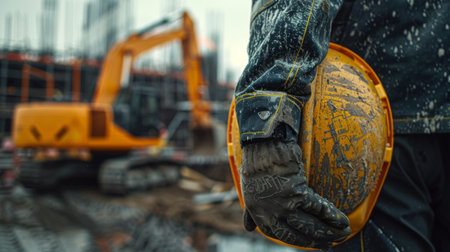 A construction worker closely observes a modern building site with cranes and a reflective glass facade. The scene captures urban development and progress in architecture.