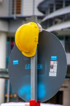 Munich, germany. November 23th 2020. Yellow hardhat hangs on construction site sign.