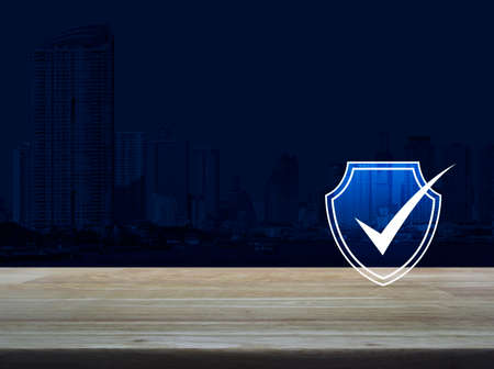 Security shield with check mark flat icon on wooden table over modern office city tower and skyscraper, Technology internet cyber security and anti virus concept