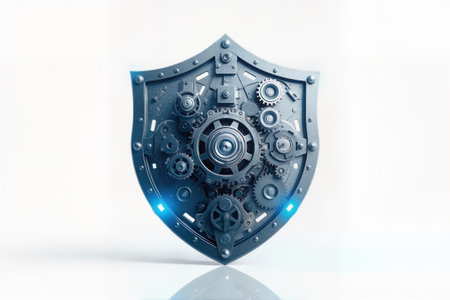 Futuristic shield made of intricate mechanical gears and cogs with metallic finish. for cybersecurity, technology protection, steampunk design, and digital defense concepts.