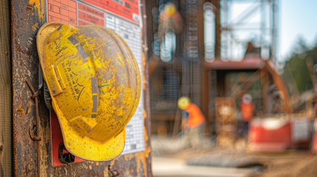 A yellow safety helmet with a hazard symbol rests on a wooden surface at a construction site. The surroundings are messy, indicating ongoing work and potential safety risks.