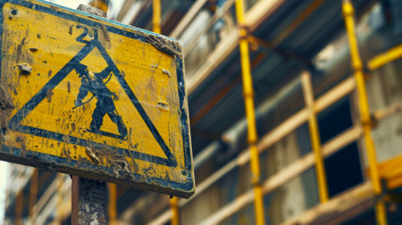 A yellow and black construction zone warning sign is prominently displayed, contrasting against a bright blue sky. The image captures workers and equipment, including a crane, at a construction site. The scene depicts an industrial environment with metal beams and offers potential applications in various commercial and editorial projects.