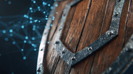 A stunning wooden shield showcases a rich texture against a geometric patterned background. This image captures the essence of rustic and medieval themes, perfect for designs in art or decoration.