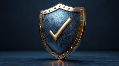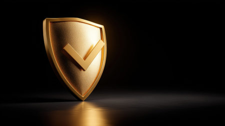 This 3D illustration features a golden shield with a prominent checkmark symbol, representing security, trust, and protection in a dark setting.