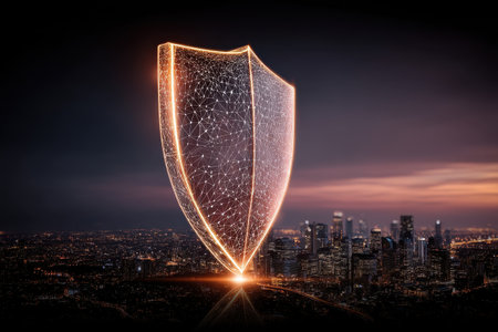 Shield protecting urban skyline cybersecurity concept glowing particles night city