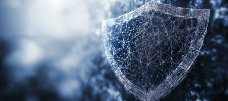 This image features a digital shield symbolizing cybersecurity, with glowing lines and stars against a dark background, highlighting modern protection concepts in technology.