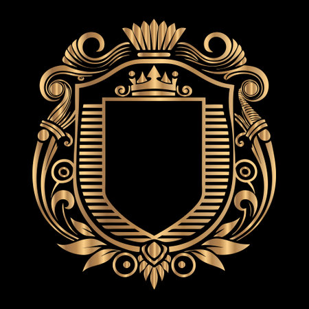 A polished gold shield with an ornate border sits on a dark textured surface. Clear details and vibrant colors...