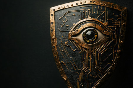 A shield with cybernetic patterns and a robotic eye represents AIs role in boosting cybersecurity and vigilance.
