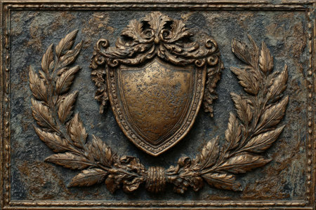 Antique bronze shield with a surrounding laurel wreath embossed on a weathered metallic surface, symbolizing honor and victory.