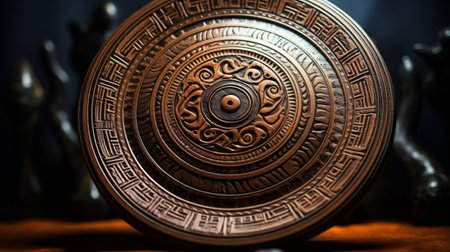 A striking close-up view of a beautifully designed shield featuring intricate patterns, metallic accents, and a rich color palette, ideal for artistic or historical themes.