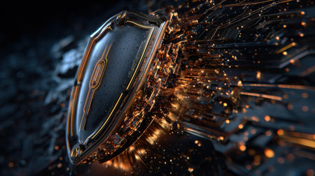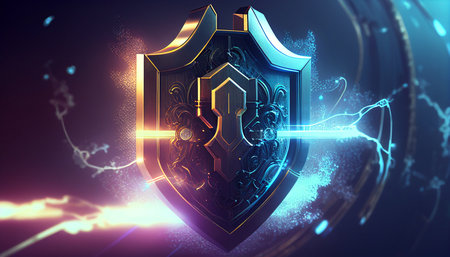 AI Generated. Glowing Metal Shield Security Protection Dark Background