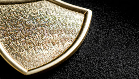 Detailed close-up image of a decorative golden shield emblem set against a dark textured surface. The shield's intricate design and the interplay of light and shadow on the textured background are emphasized.