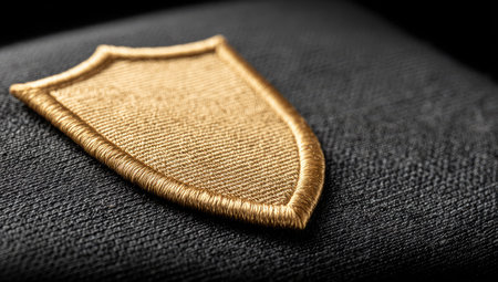Close-up view of a golden shield-shaped embroidered patch affixed to a dark fabric. The image highlights the intricate details of the stitching and the texture of the patch and the fabric.