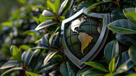 Metaphorical photo with globe encased in a protective shield or surrounded by green foliage, global sustainability concept