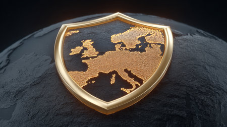 A stunning 3D render of a golden protective shield icon hovering over Europe, showcasing intricate detailing and a textured globe background for security themes.