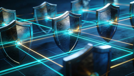 This image captures a digital security theme featuring glowing shields connected by a network, symbolizing protection and safety in the technology landscape.