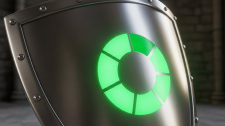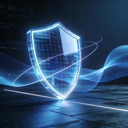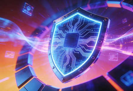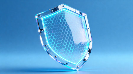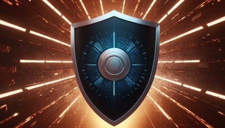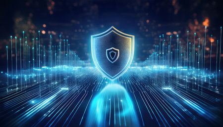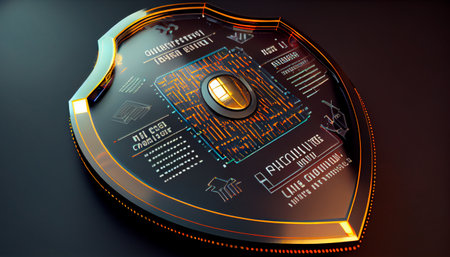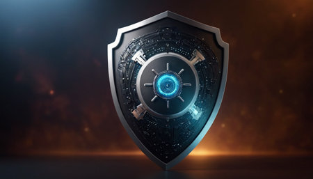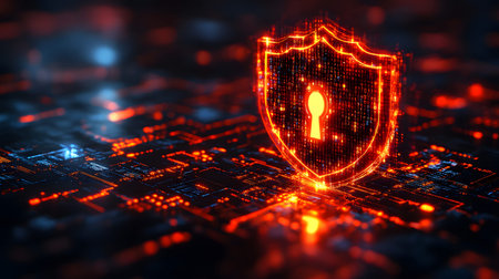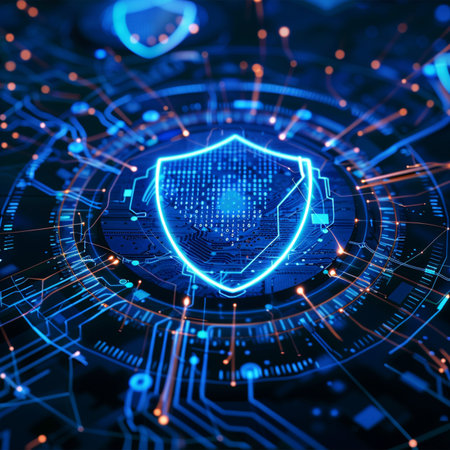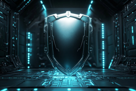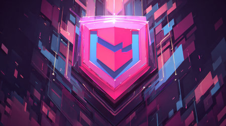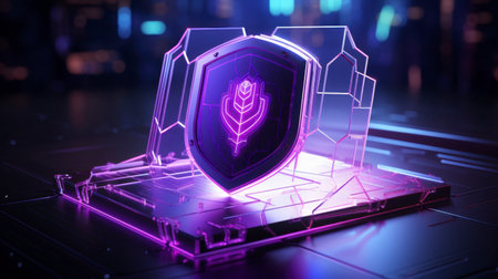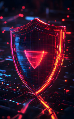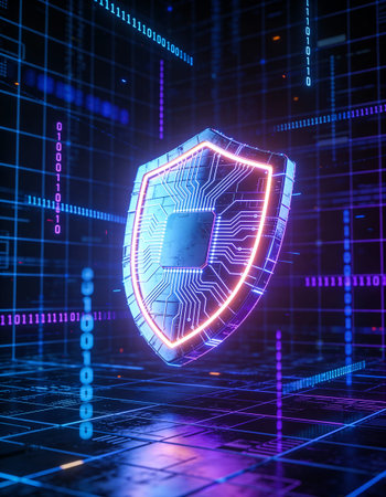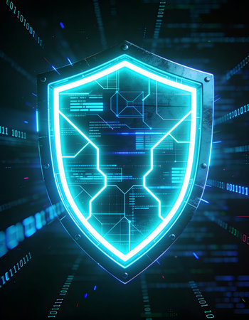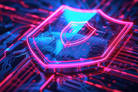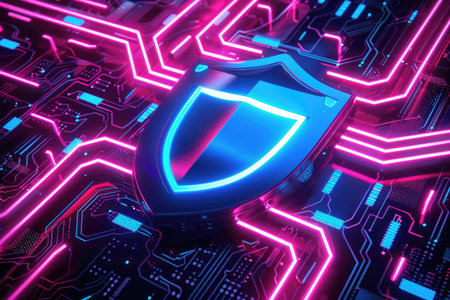 A sleek, glowing shield composed of vibrant neon circuits, evoking advanced technology and safeguarding digital information in a high-tech environment.