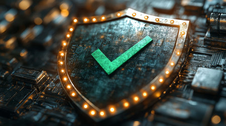 A luminous shield symbol illuminated on a detailed circuit board, symbolizing robust digital protection and advanced cybersecurity measures in a high-tech environment.