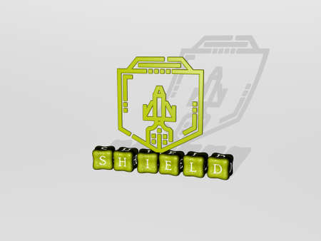 3D representation of SHIELD with icon on the wall and text arranged by metallic cubic letters on a mirror floor for concept meaning and slideshow presentation. illustration and design