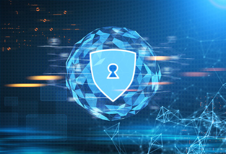 Glowing security shield hologram with a keyhole with an orb background against a blurred blue futuristic surrounding. Polygons. Toned image double exposure mock up