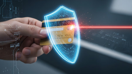 A hand holds a dark blue credit card with a glowing blue digital shield and red laser....