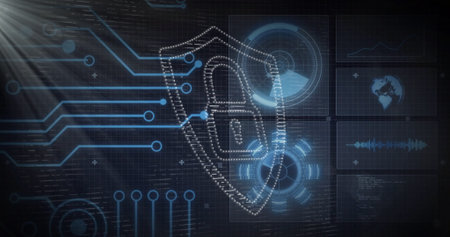 Wireframe shield with lock icon floating in dark grid interface, with circuit lines and data panels. Cybersecurity, encryption, data protection, digital infrastructure, futuristic interface, technology, information security