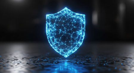 A glowing cybersecurity shield on textured surface symbolizes protection