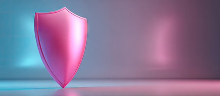 3D rendered graphic image of a shield, displaying a reflective, metallic finish in vibrant pastel colors of pink and blue. The shield is featured against a blurred backdrop of sparkling lights and highlights, creating a captivating visual effect.