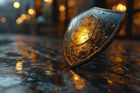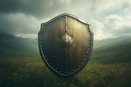 A close-up of a medieval shield adorned with water droplets, set against a blurred background. the metallic texture and rivets emphasize themes of durability, protection, and historical warfare. Generative AI