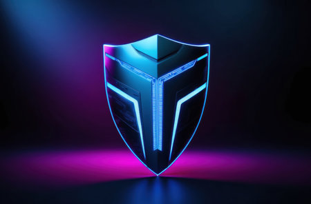 A sleek, futuristic shield design features a metallic surface and a captivating neon glow, set against a dark background, representing security and digital protection.