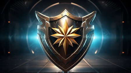 Protection shield with golden star on dark background. 3D rendering
