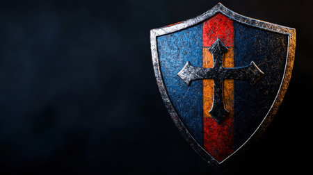Textured metal shield with a rich patina, set against a dark, moody background. suitable for historical or fantasy themes, perfect for gaming, design, and educational illustrations. Generative AI