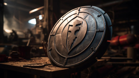 AI Generated. Medieval Metal Shield with Textured Surface and Dramatic Lighting