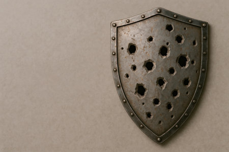 An old metal shield with numerous holes. Space for text